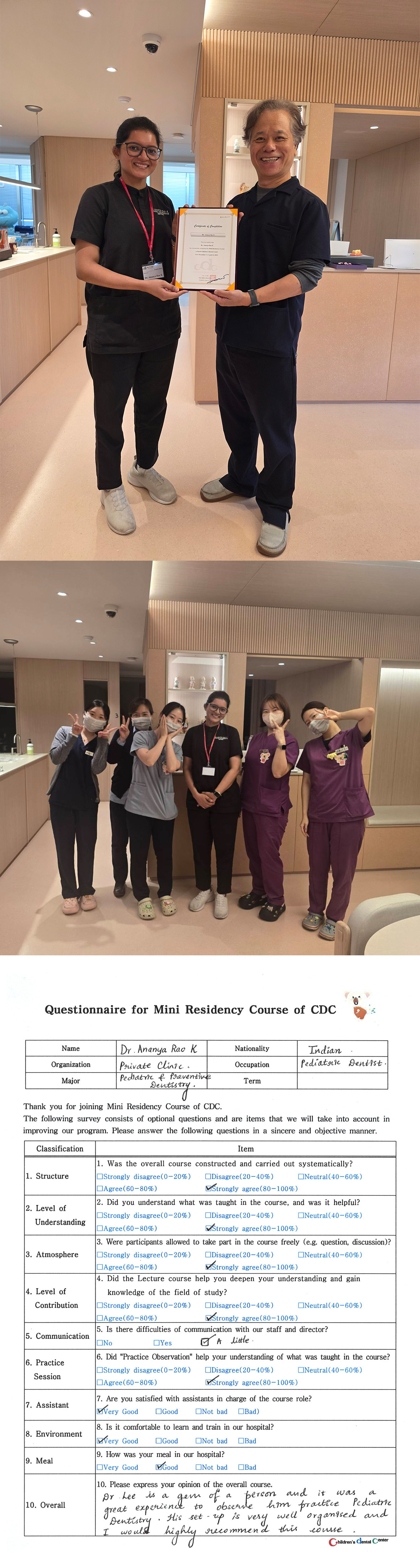 Dr. Rao K, a pediatric dentist from India, completed a Mini Residency Course, including clinical observation, at the CDC Children's Dental Clinic in Cheongdam on Nov 07~12, 2025.